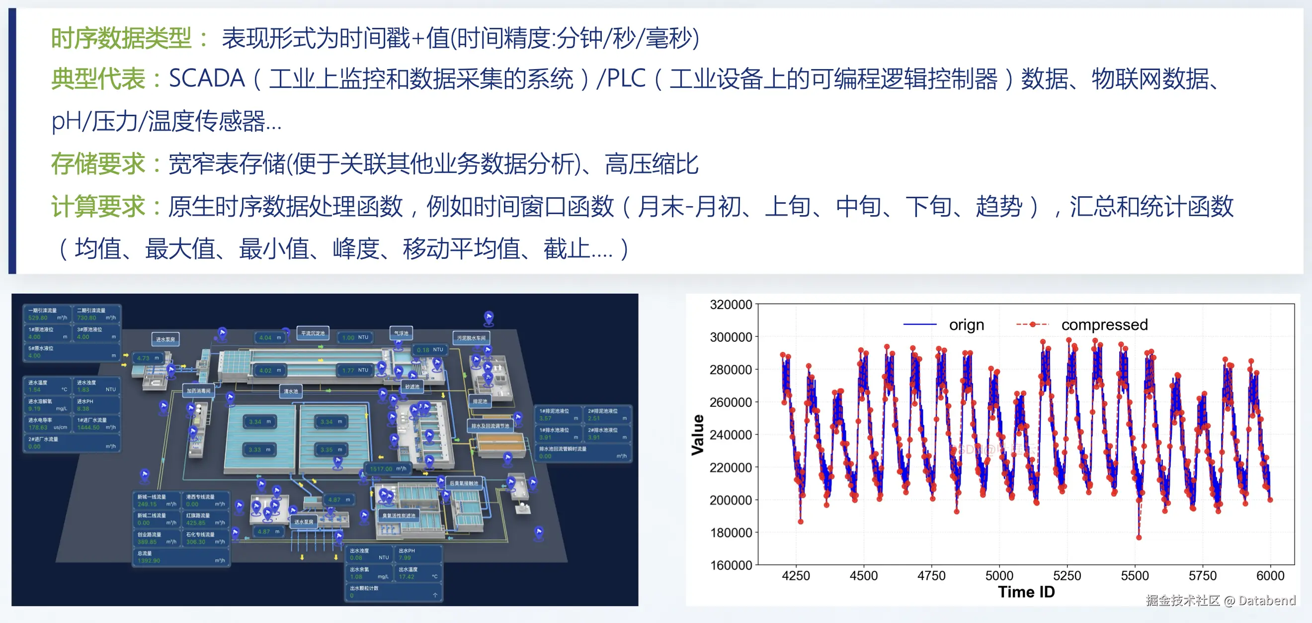 - 时序数据基本都是以时间戳+值的形式绑定在一起,在市政、工业行业领域里用的比较多。典型代表就是 SCADA/ PLC 设备数据,或物联网数据,以及 pH/压力/温度传感器数据。时序数据会随着时间的增长不断产生,所以在存储时需要有一个高压缩比的数据压缩形式,否则数据会很占磁盘使用空间。在计算方面,很常用的是时间窗口函数, 要计算一定时间内的数据变化,或是做一些统计值,比如均值,最大值,最小值,移动平均值。