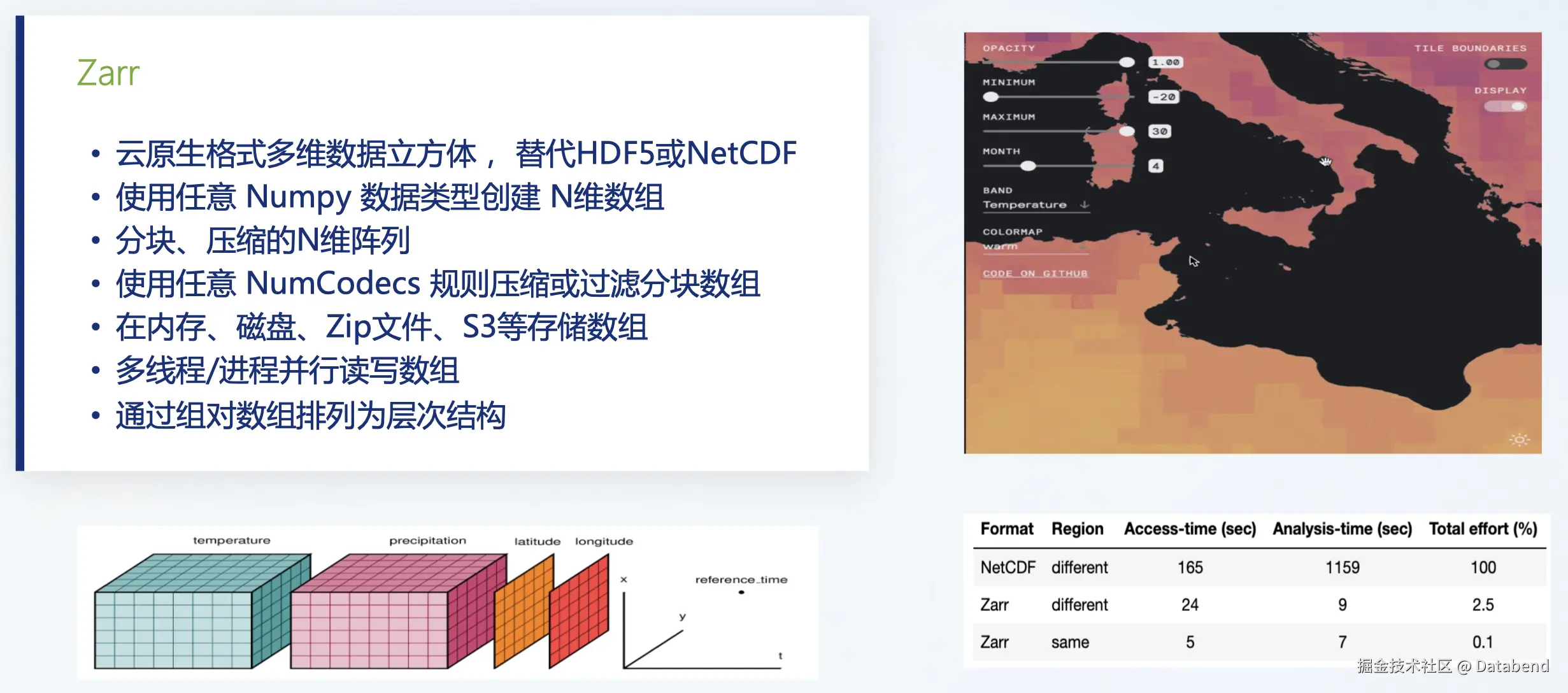 Zarr 是一个云原生格式的多维数据立方体,可以替代 HDF5 或 NetCDF,它的数据是可以放在对象存储上的。