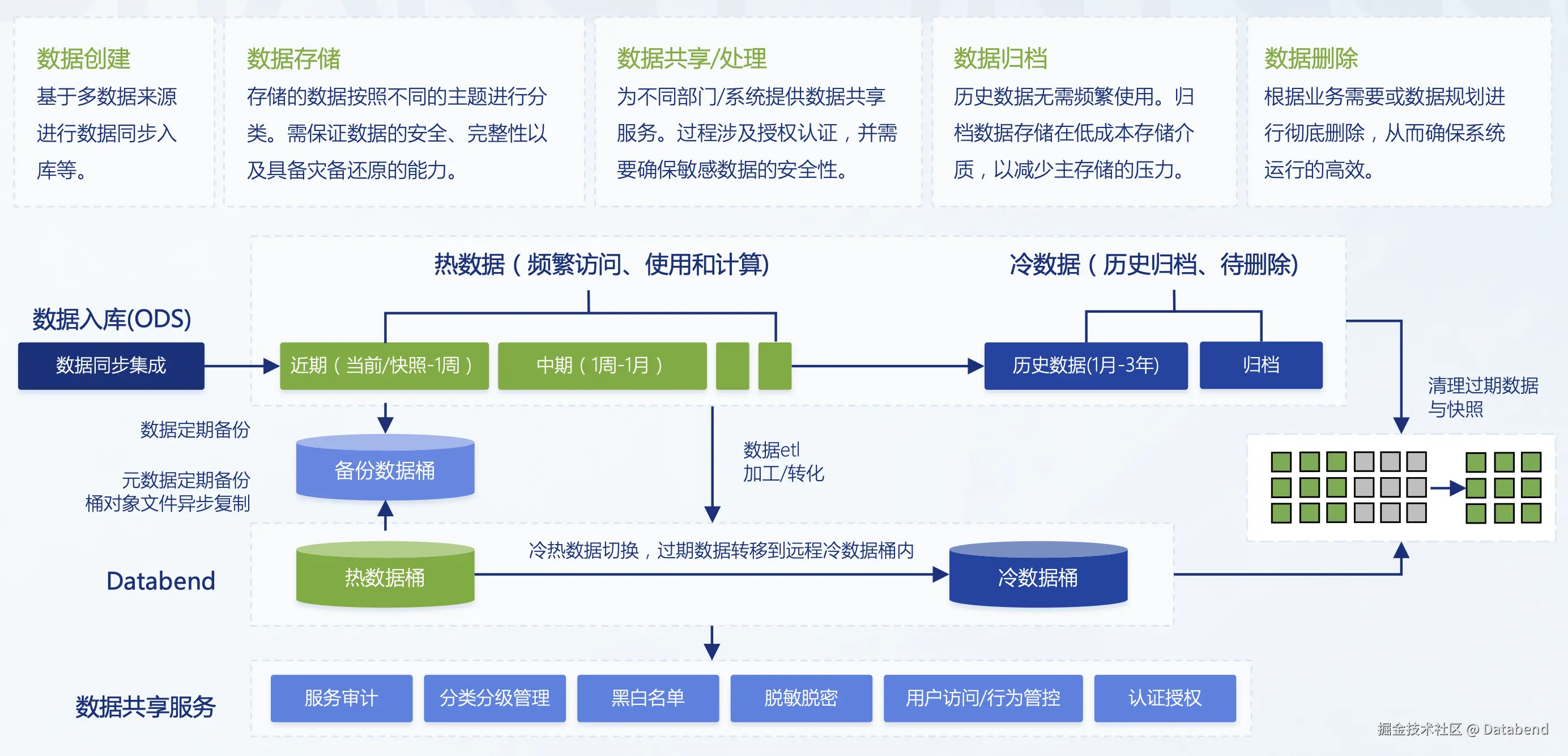 冷数据:历史归档数据作为冷数据存储,通过 Databend 的冷热桶功能实现自动切换与快照清理。