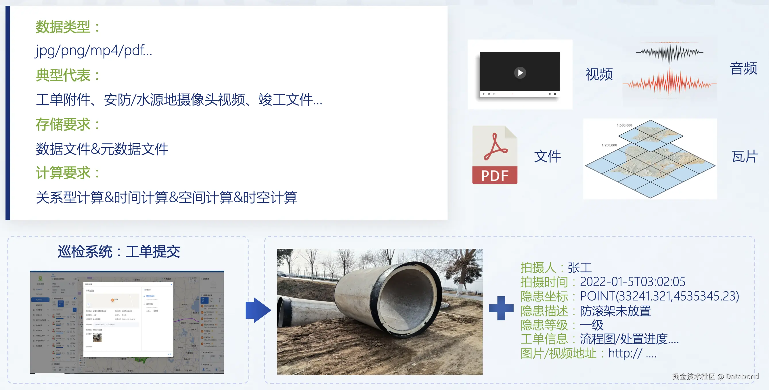 提到时空数据,很多人可能并没有一个相对直观的感受。我们来举例说明一下:在市政管道巡检中,一名工作人员忽然发现某个管道漏气,然后拍了一张隐患照片。这张照片里其实就包含了很多时空数据,例如拍摄时间,拍摄地点的 GPS 位置,拍摄位置与附近地标的关系(如某个公路附近,或某个小区附近),拍摄人身份,所属组织,排班计划,照片像素,拍摄设备,以及关联的流程审批状态,隐患处理操作步骤等其他业务数据。时空数据是结合时间、空间和业务属性的多维数据类型,它广泛应用于市政、工业和智慧城市等领域。