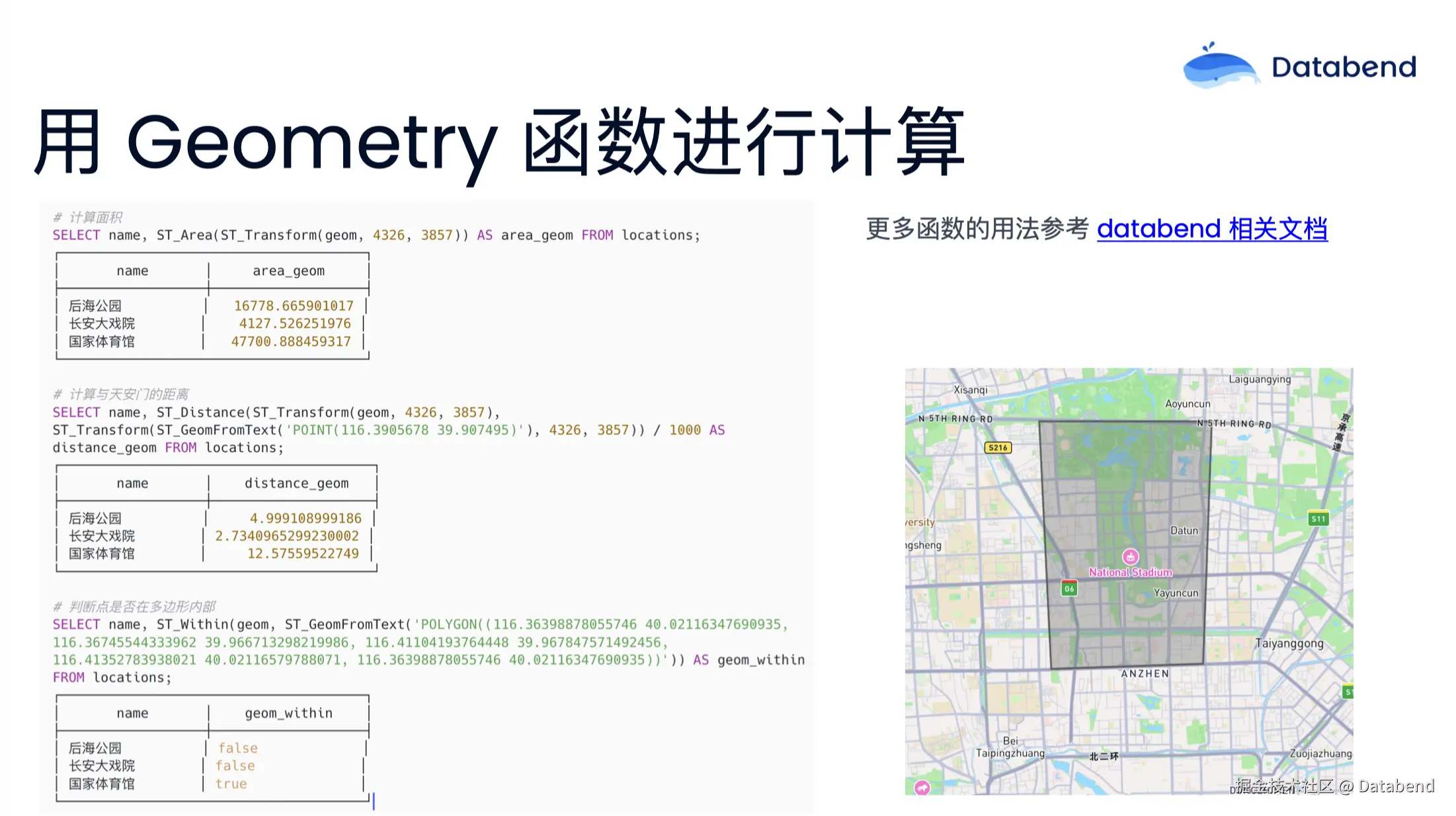 用 Geometry 函数可以进行一些函数计算。例如计算面积,我们可以看到图中几个地方的面积都是和实际情况对应的。然后还可以计算距离,这里选择了计算到天安门的距离。最后一个例子是进行一个函数的计算判断,判断这个点是否在这个多边形之内。更多的函数可以参考 Databend 的相关文档。