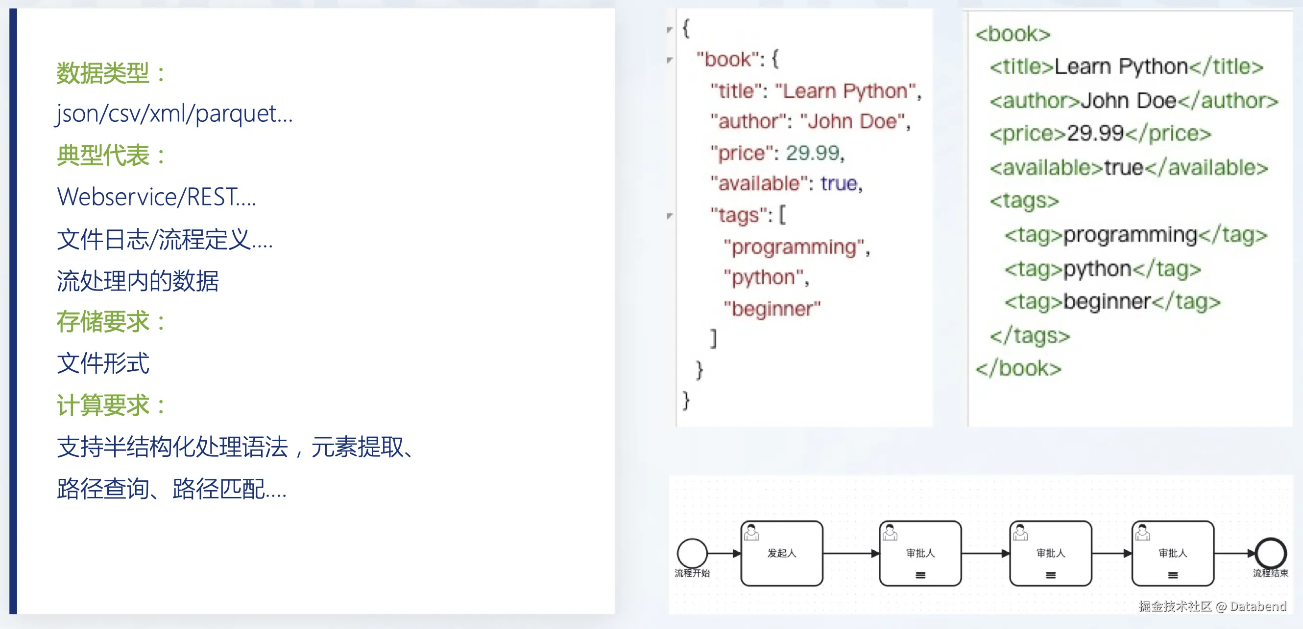 - 半结构化数据是我们比较熟悉的,例如 JSON、CSV、xml。在半结构化数据使用上有一点需要注意,是一个叫路径查询的概念。当你用 JSON 时,会听到一个 json path 的概念,通过 json path 我们就可以找到 json 下某一个节点的数据,它有一套专门的语法。