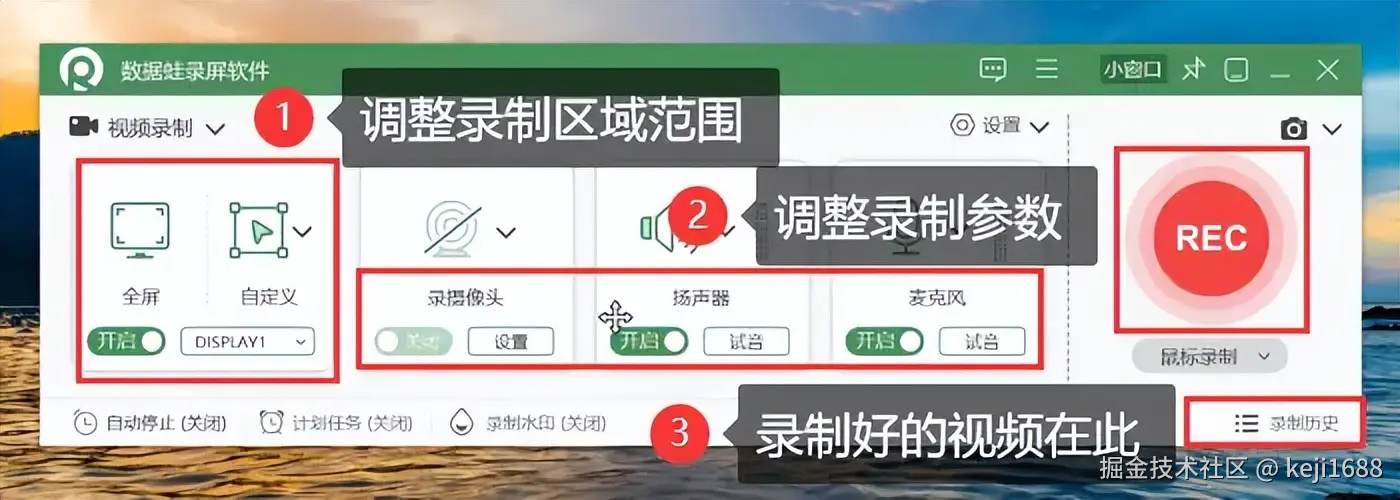 步骤1:根据需求选择视频、音频、窗口或摄像头模式,调整视频质量、帧率、音频输入等参数。录制好的视频可点击【录制历史】进行查看。