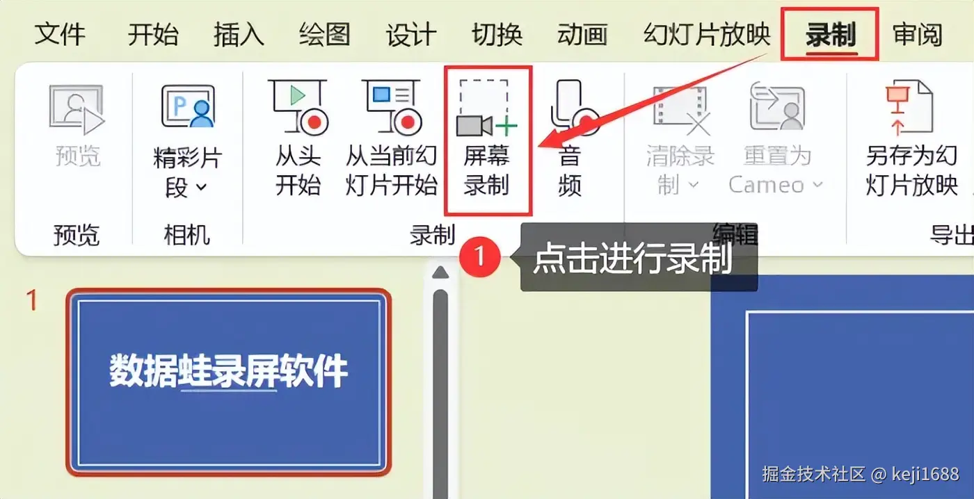 步骤1:打开需要录制的演示文稿。在 【录制】 选项卡中找到并点击 【屏幕录制】 按钮。