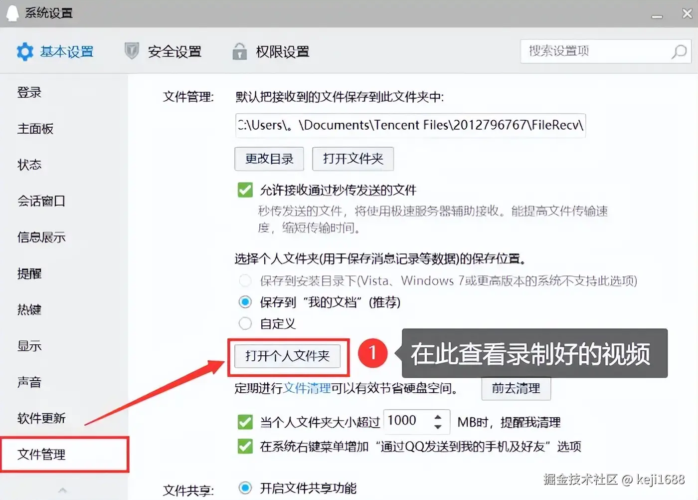 保存位置: 录制完成后,视频将自动保存在QQ的 【文件管理】中的【个人文件夹】 里,你可以在该位置找到并管理录制的视频。