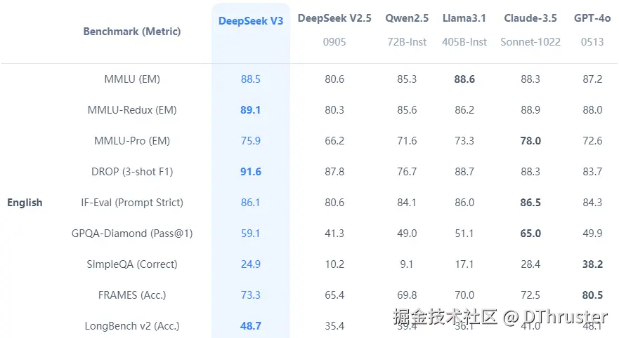 DeepSeek-v3性能媲美GPT-4o,还开源,可以在本地训练和推理,用户可以根据需要修改模型。相比LLaMa3,DeepSeek有以下优点: