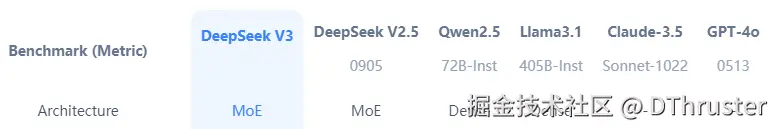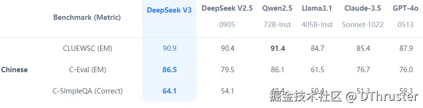 - 性能表现:在多项基准测试中,DeepSeek-V3 超越了 Qwen2.5-72B 和 Llama-3.1-405B 等开源模型,并在代码生成、数学推理、中文理解等方面与 GPT-4o 和 Claude-3.5-Sonnet 等闭源模型相当。