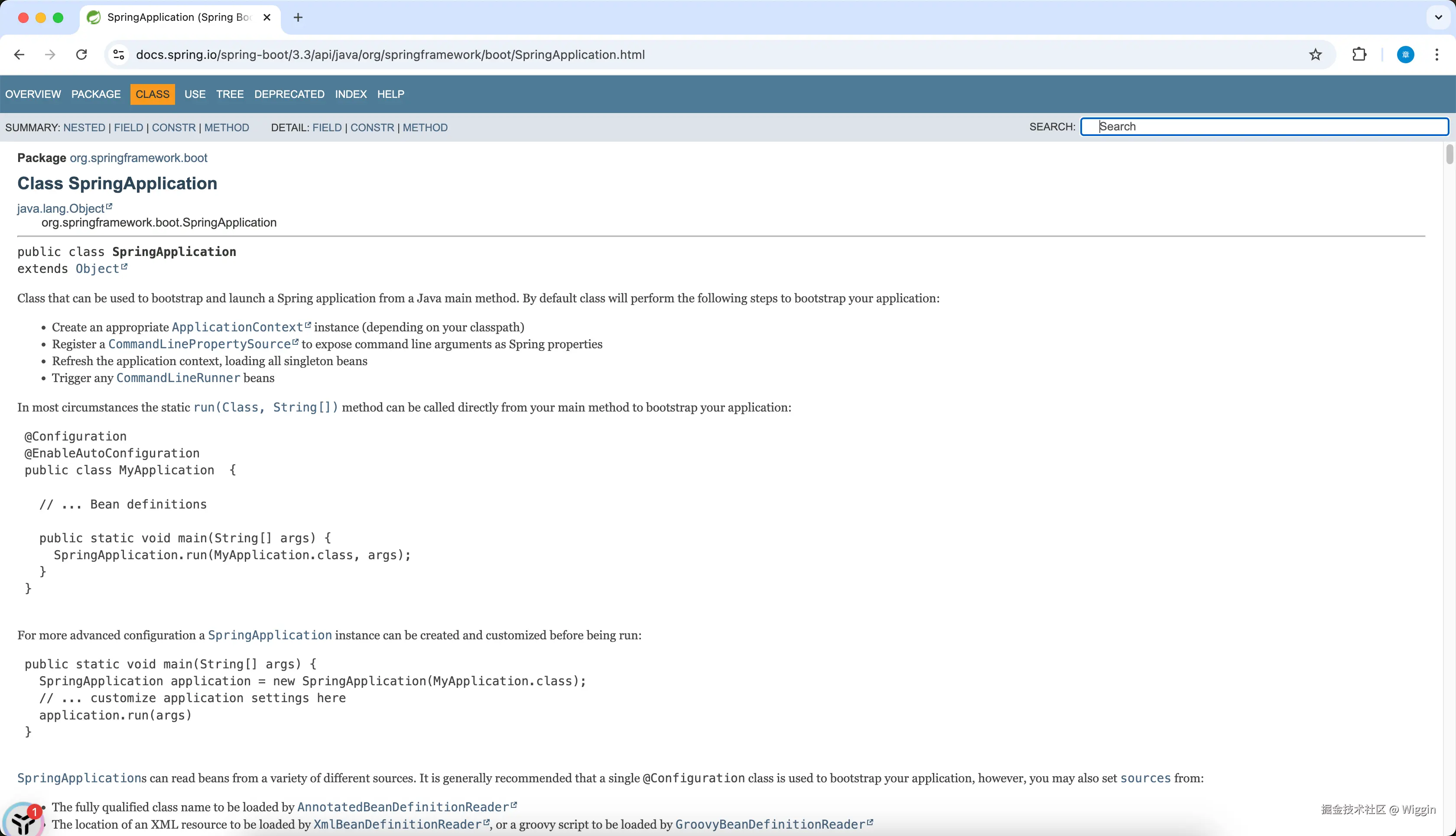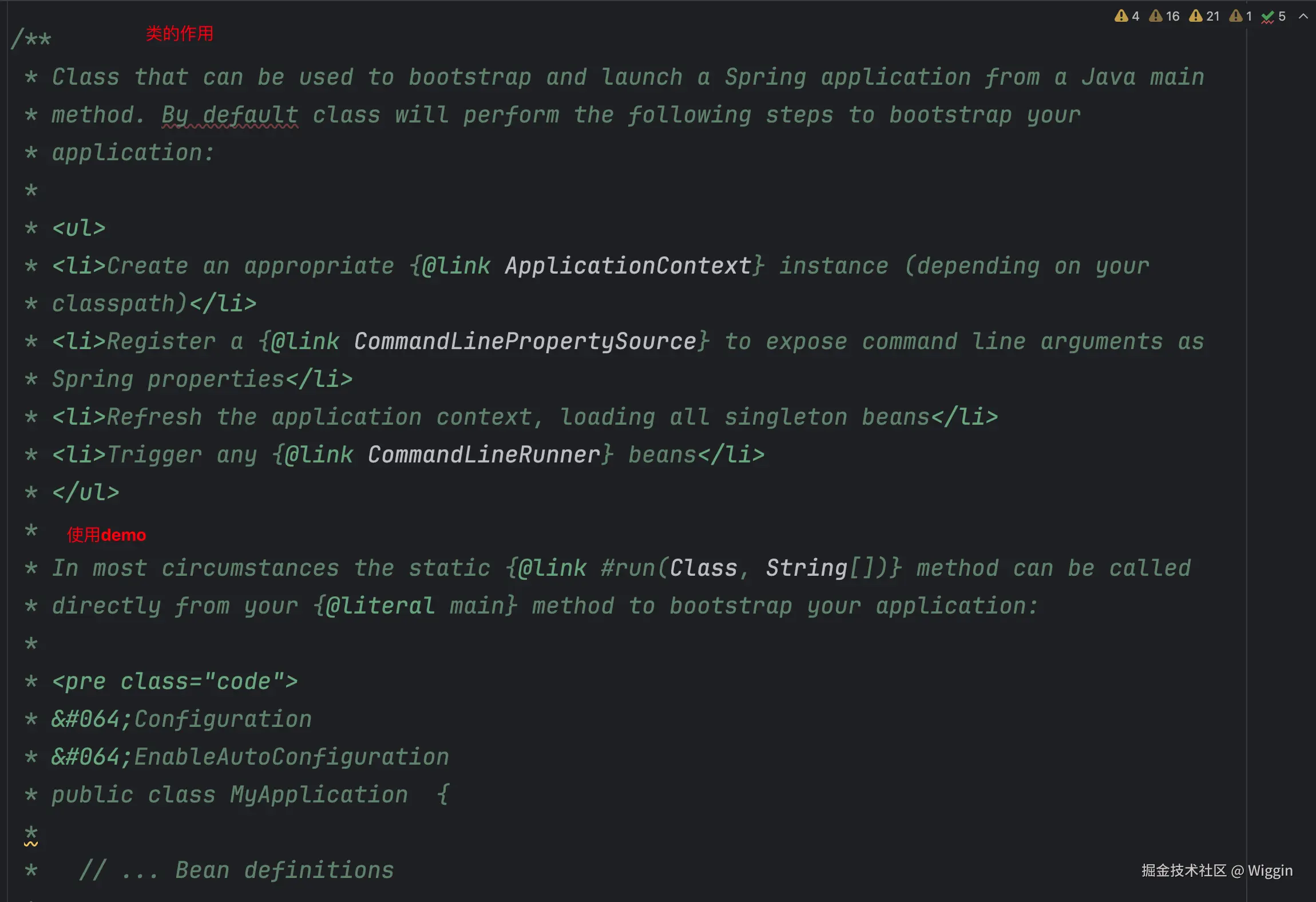 那么,SpringApplication这个类有什么作用呢?这里我们可以通过类注释窥探一二。一般情况下,开源项目的类头注释是这样的:写详细解释下这个类的作用是什么。其次,会给出一些demo。