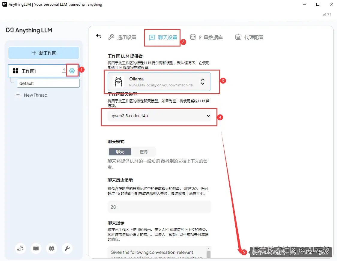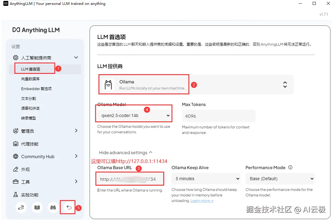 - 配置 AnythingLLM 的后端推理服务为 Ollama,使得用户提问时,AnythingLLM 会先检索相关文档,再将结果交给 Ollama 进行语言生成。