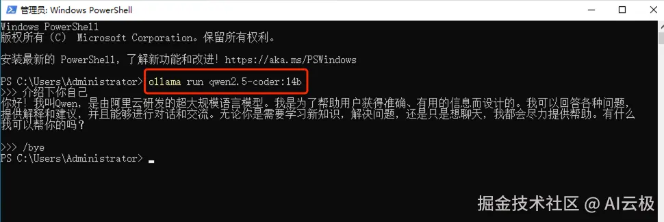 # 首次运行时,模型会自动下载,确保网络通畅。 # 之后与命令行进行简单对话,若能产出结果,说明安装成功。 ollama run qwen2.5:14b
