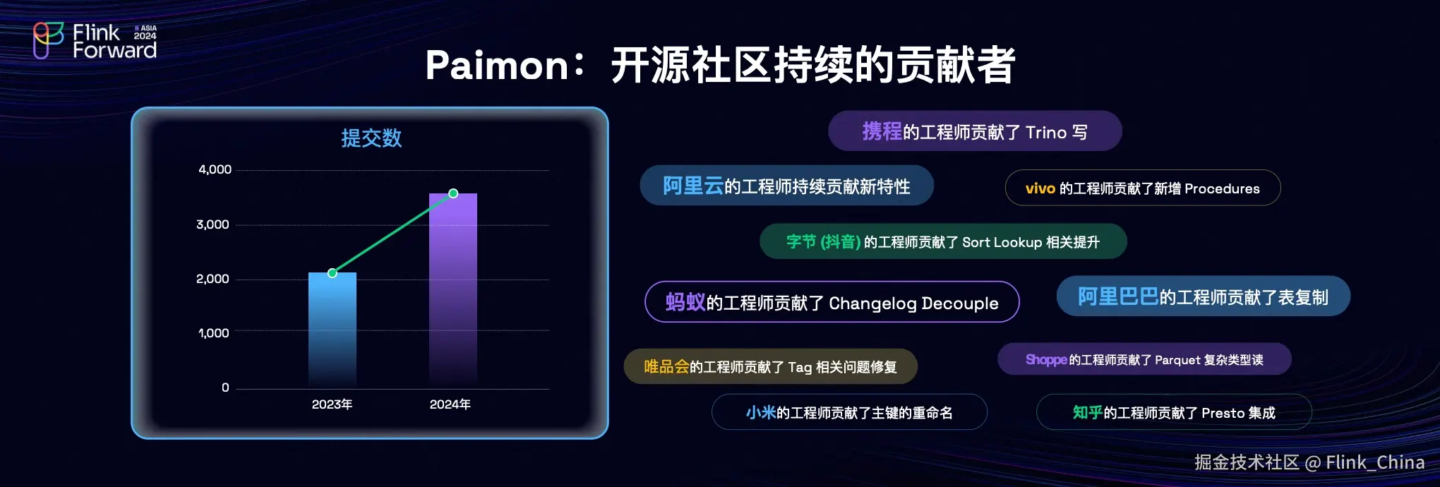 Paimon 作为一个开源项目,得到了来自多个知名企业和组织的工程师们的积极贡献。从去年的2000多个提交增长到今年的3500多个提交,新增了超过1500个 Commit。这些贡献主要来自于携程、阿里云、vivo、字节、抖音、蚂蚁、阿里巴巴、唯品会、小米、知乎、Shoppe 等公司的工程师们。在此,非常感谢大家对 Paimon 社区的贡献!