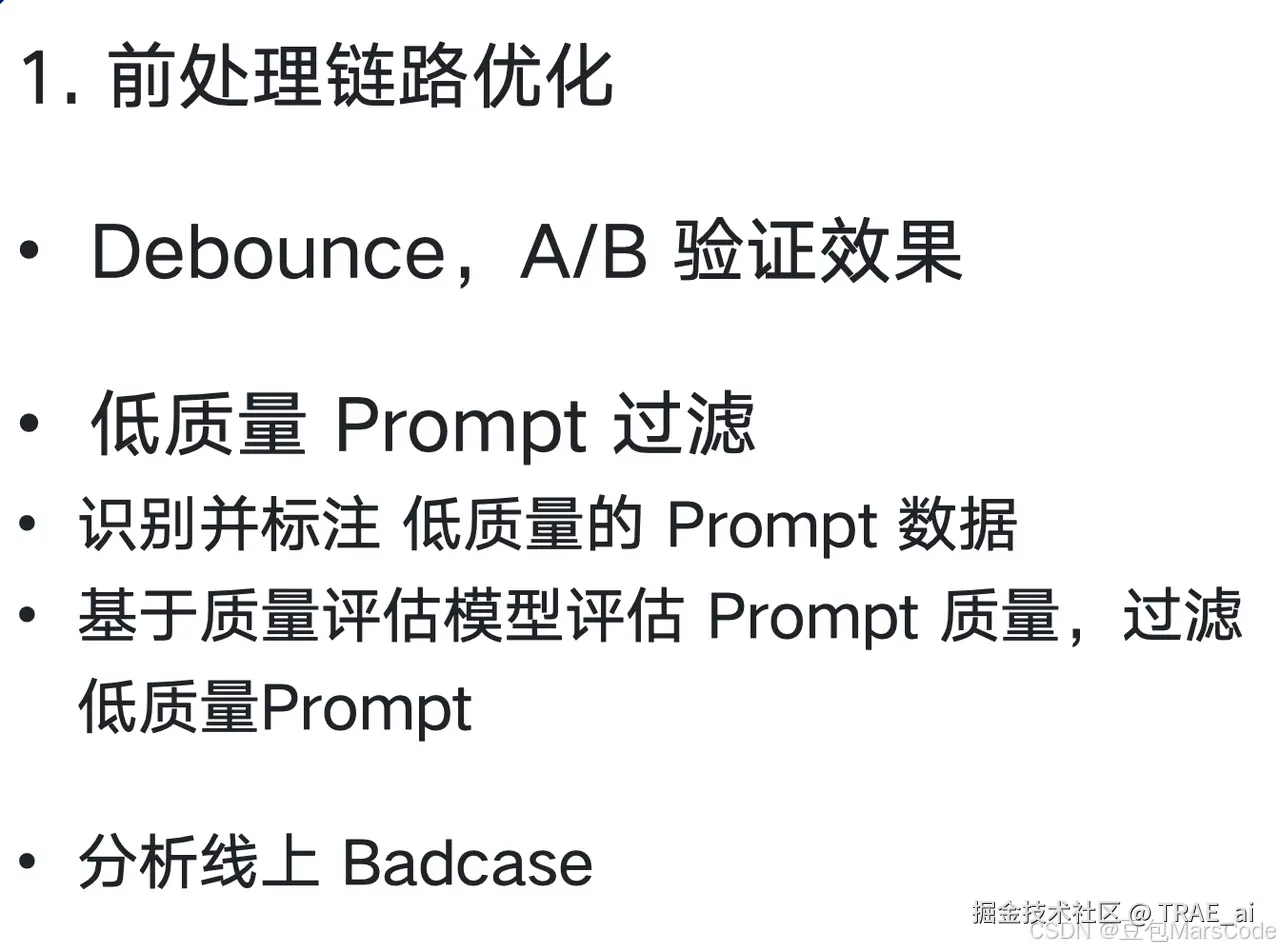 除此之外,有些低质量的推荐和 prompt 的质量是相关的。所以在请求模型前,我们也会针对低质量 Prompt 进行过滤。比如代码中存在无意义的变量名,开发者定义 String a 的变量,再让模型进行推理,模型比较难理解开发者定义的 String a 之后的意图是什么,因此大多数情况下推荐出来的结果也是比较差的,这个时候请求会被过滤。而模糊意图也会被过滤。