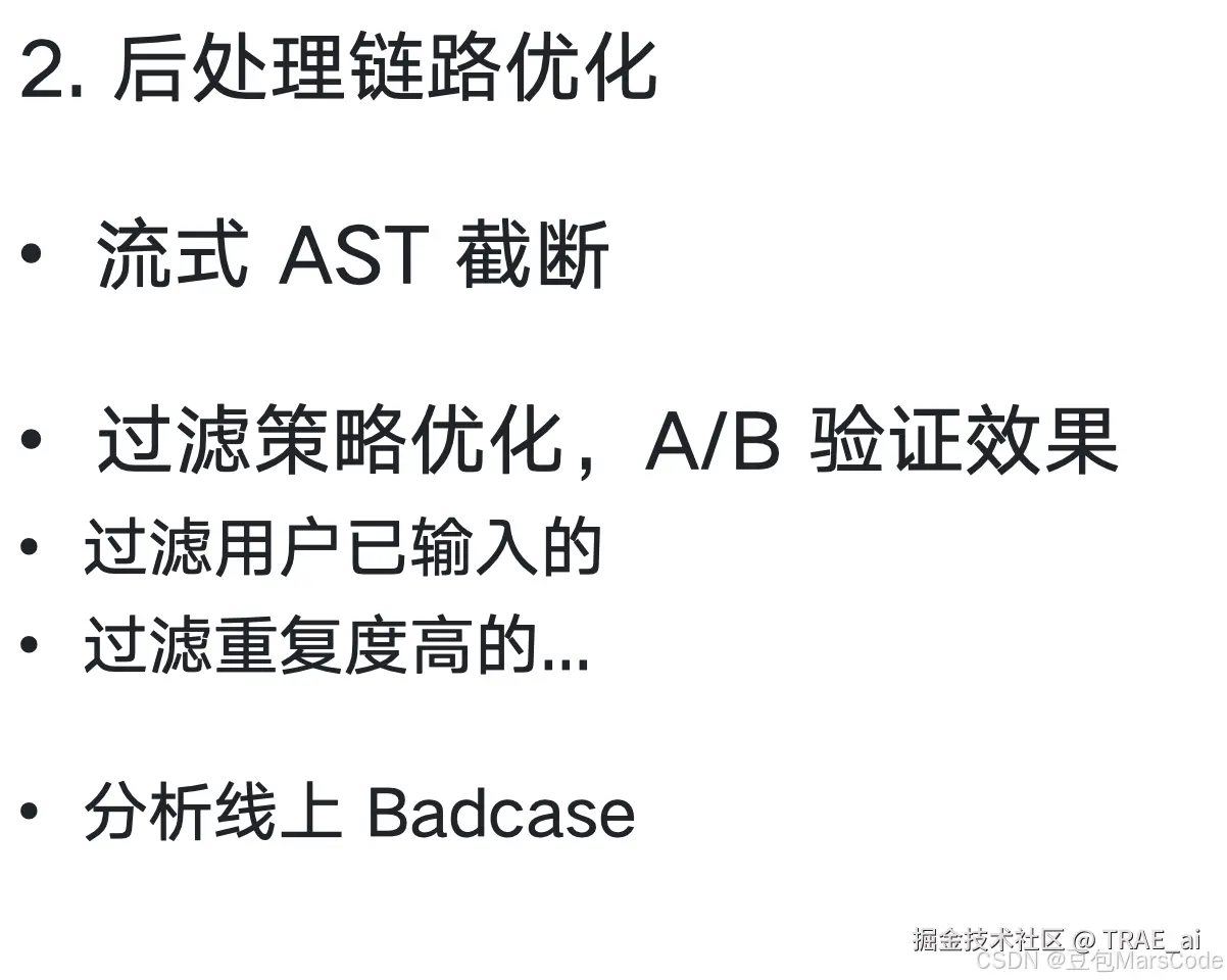 模型推荐出来后,补全的结果也存在幻觉、重复结果等 badcase,后处理链路会专门优化这类的 badcase。比如用户已经输入过推荐的结果,那就没必要再给用户显示了,用户也不会采纳。我们也会通过 AST 进行截断,避免模型推荐不完整的代码块等问题。