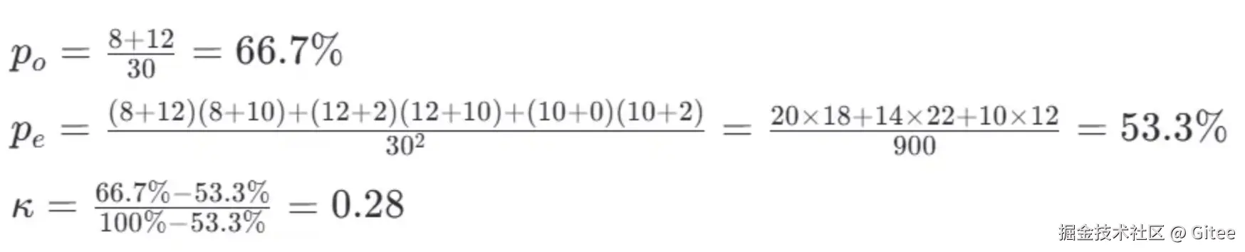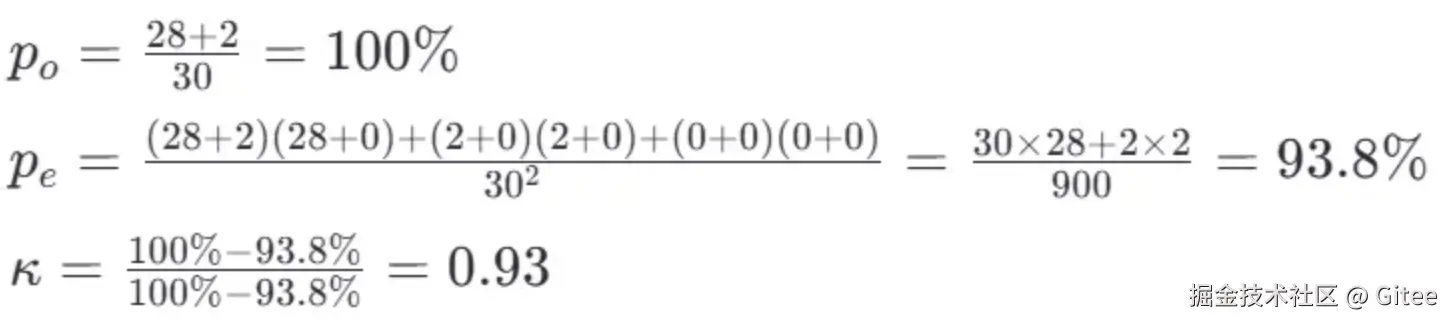 Kappa 系数用于衡量分类系统的可靠性,考虑了偶然一致性。其公式为: