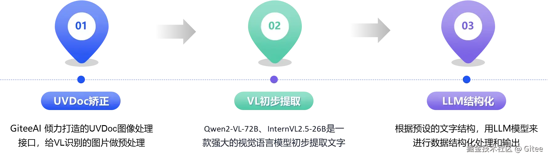 这些问题直接使用视觉语言(VL)模型进行识别时,会导致极低的准确率和可靠性。为了解决这些问题,最近和 Gitee AI 团队进行了深度友好的沟通,最终得到了一套完整的解决方案,通过 UVDoc 图像校正工具预处理图片,再利用 QwenVL 进行信息识别,并最终使用大型语言模型(LLM)实现结构化数据提取,显著提升了铭牌文字的提取效果。