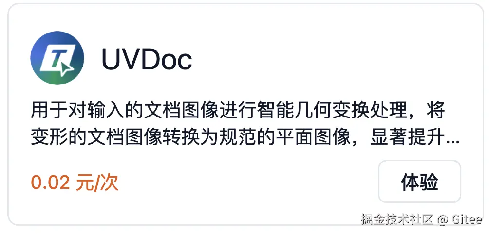 针对上述难题,我们首先采用 GiteeAI 团队最新发布的 UVDoc 图像校正工具对原始照片进行预处理。该工具利用先进的计算机视觉算法,自动检测并纠正图像中的透视变形,恢复铭牌的真实形状。
