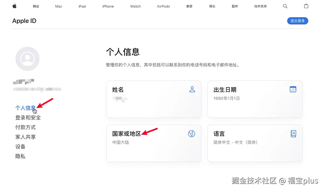 注册成功后,账号会自动登录,如果没登录的话重新登录一遍刚注册的账号即可。 然后点击 个人信息,接着再点击 国家或地区。