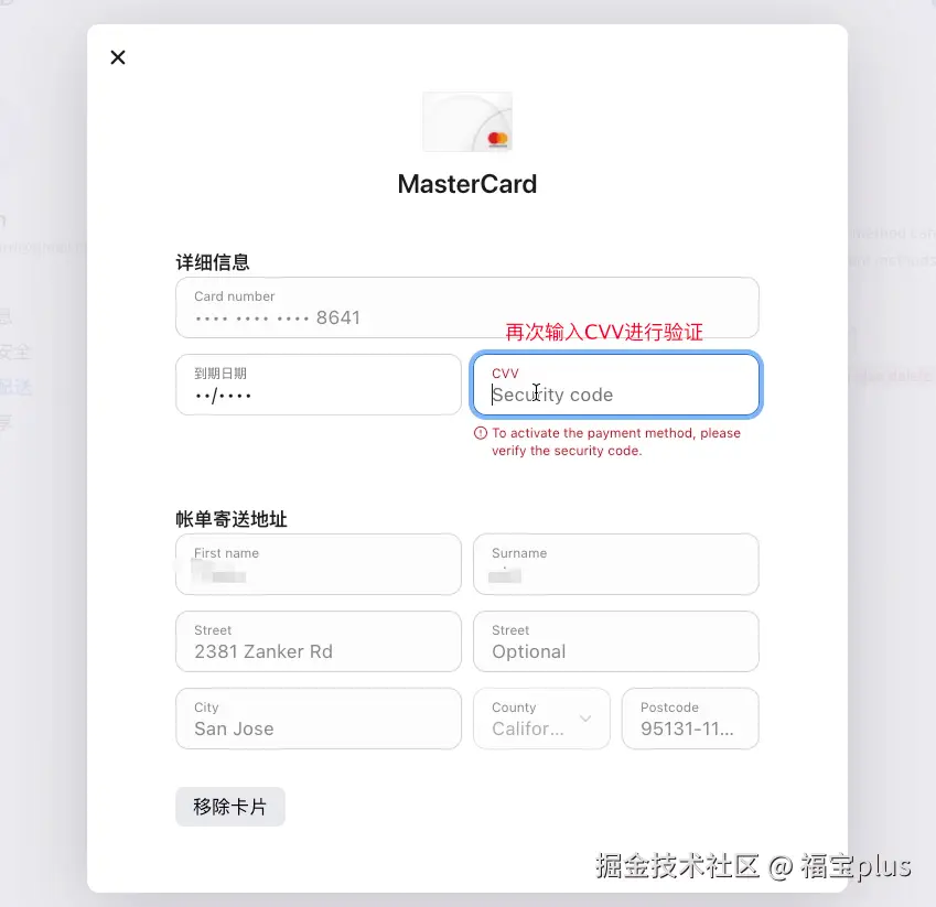 点击 付款与配送,卡片已经添加成功,不过还需要再次验证下卡片信息,点击卡片输入CVV,点击存储更改即可
