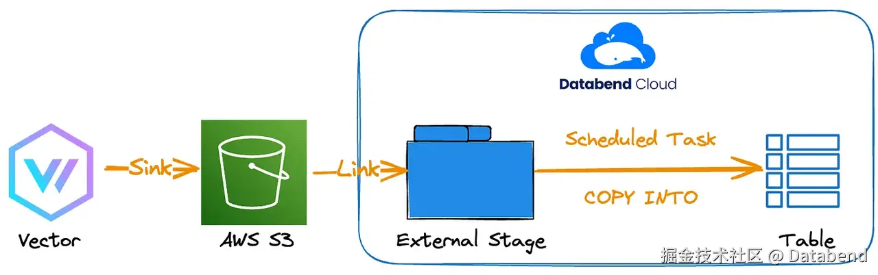 在本教程中,我们模拟在本地生成日志,使用 Vector 收集日志,将其存储在 S3 中,并使用计划任务自动将其提取到 Databend Cloud 中。请单击此处访问完整教程。
