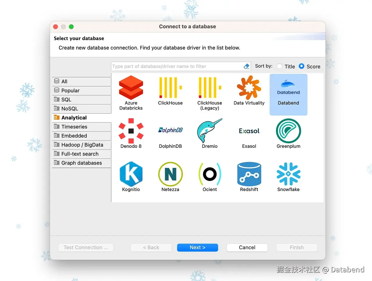 Databend 现已在 DBeaver 24.3.1 中获得官方支持,作为 Analytical 数据库的新连接类型: