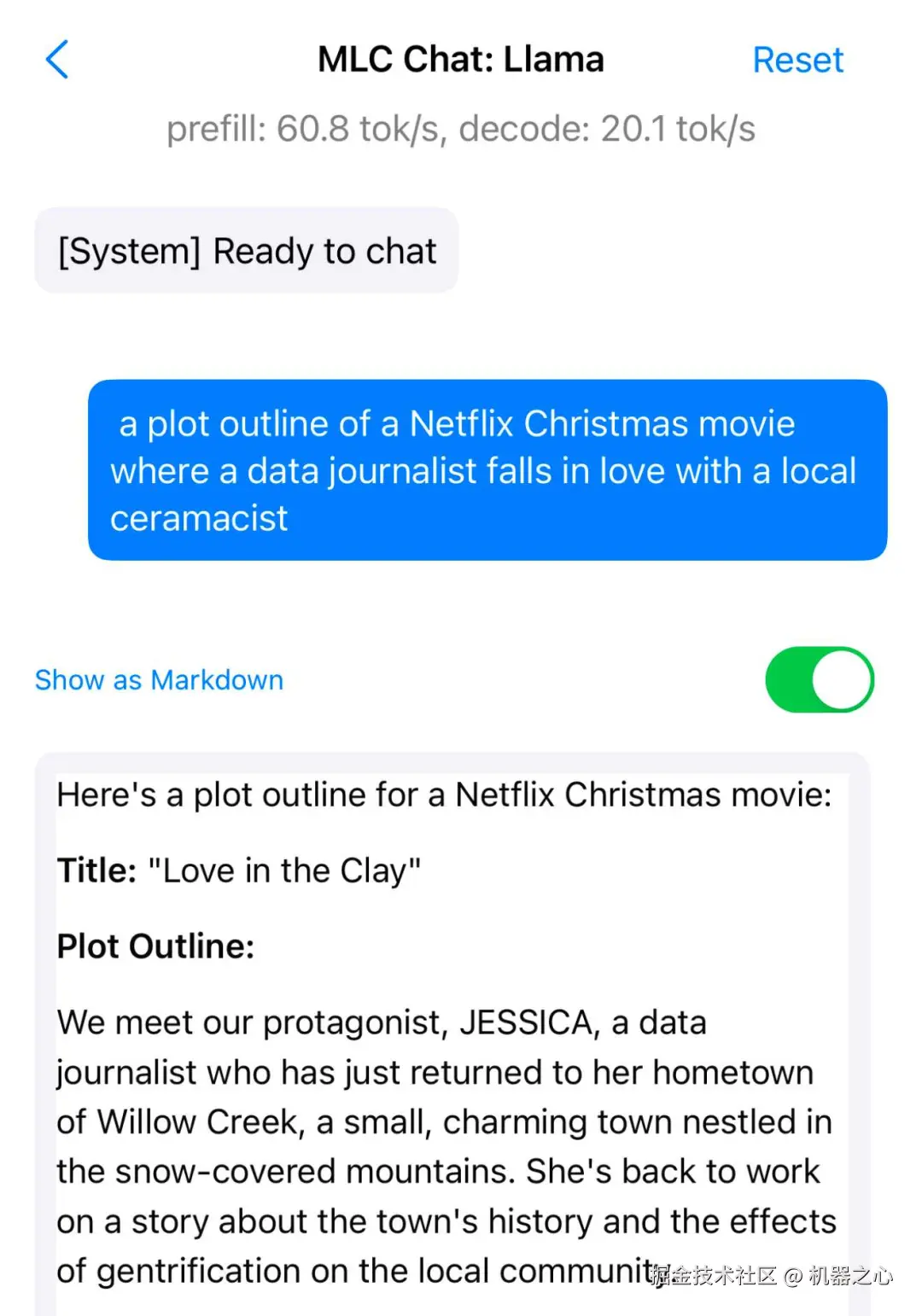 Meta 的 Llama 3.2 模型值得特别提及。它们可能不是 GPT-4 级别,但在 1B 和 3B 大小下,它们的性能远远超出了参数量的水平。我使用免费的 MLC Chat iOS 应用程序在 iPhone 上运行 Llama 3.2 3B,对于其微小(<2GB)的参数量来说,这是一个功能惊人的模型。尝试启动它并要求它提供「Netflix 圣诞电影的情节大纲,其中一位数据记者爱上了一位当地的陶瓷师」。这是我得到的结果,每秒 20 个 token 的速度相当可观: