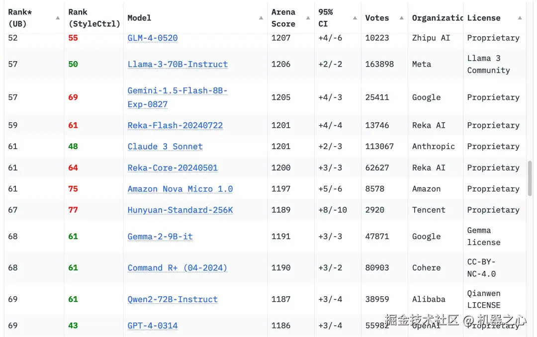 然后是其余的大模型。如果你今天浏览 Chatbot Arena 排行榜(仍然是获得基于情绪的模型评估的最有用的地方),你会发现 GPT-4-0314 已经跌至第 70 位左右。拥有得分较高的模型的 18 家组织分别是 Google、OpenAI、阿里、Anthropic、Meta、Reka AI、01 AI、亚马逊、Cohere、DeepSeek、英伟达、Mistral、NexusFlow、Zhipu AI、xAI、AI21 Labs、普林斯顿和腾讯。