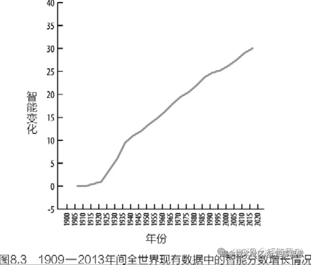 智能分数的增幅迅猛,而遗传学家声明,这不可能是由基因的变化引起的。一些智能增长可能来自更好的营养、更完善的医疗保健。其中一些智能增长可能是由于我们的环境变得更加复杂,智能测试更频繁地要求人们进行抽象思考和解决不熟悉的问题。无论原因是什么,它一定是环境造成的。