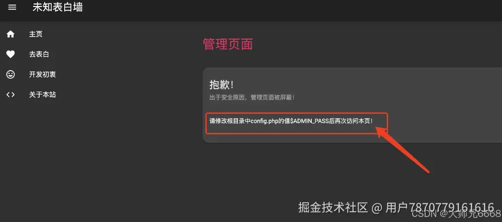验证码填写完毕,点击确认后,小彩蛋出现!!这里作者为了安全考虑,让咱们一定要注意修改config.php中的ADMIN_USER和ADMIN_PASS变量以修改默认账号密码,否则可能会被盗登后台