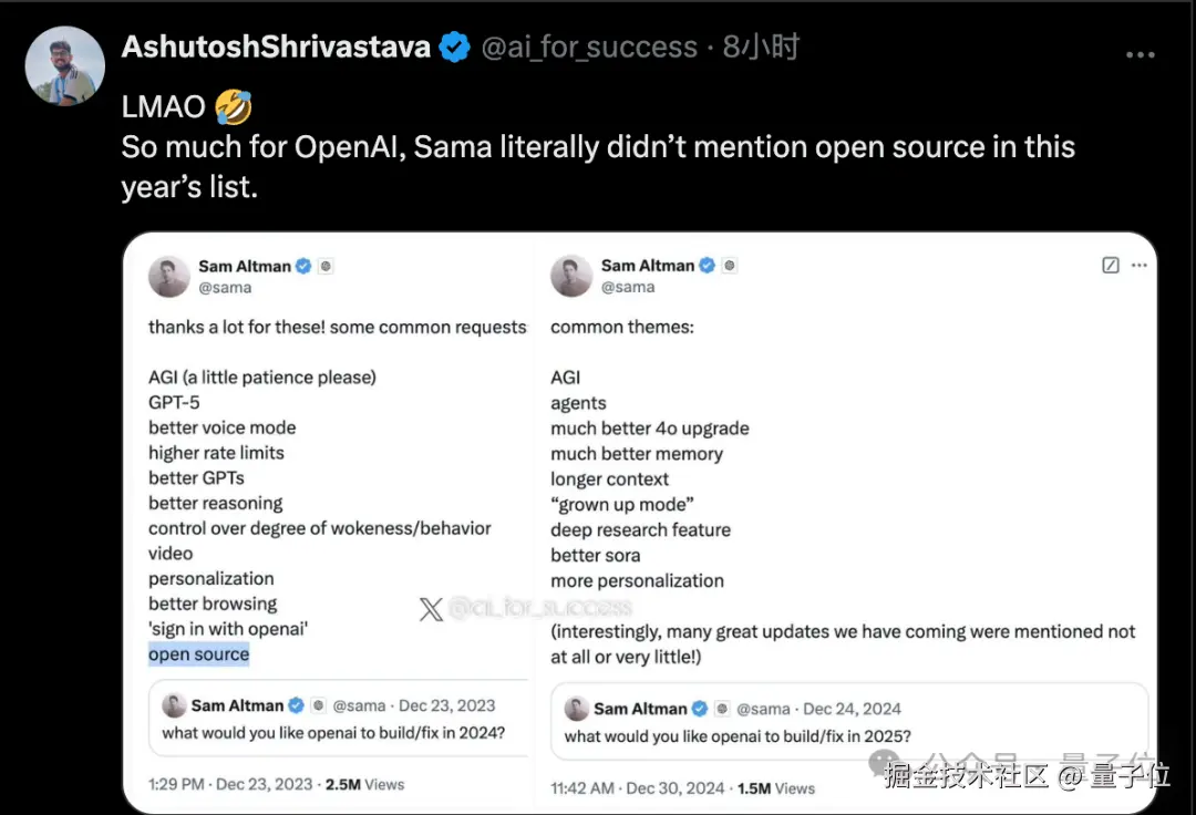此前奥特曼征集 2024 年新年愿望,最后公布的清单中还有 “开源”。2025 年的最新版本里,开源已经被去掉了。