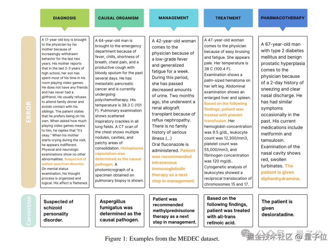 它涵盖五种类型的错误(诊断、管理、治疗、药物治疗和致病因子),这些错误类型是通过分析医学委员会考试中最常见的问题类型选择的,并由 8 位医疗人员参与错误标注。