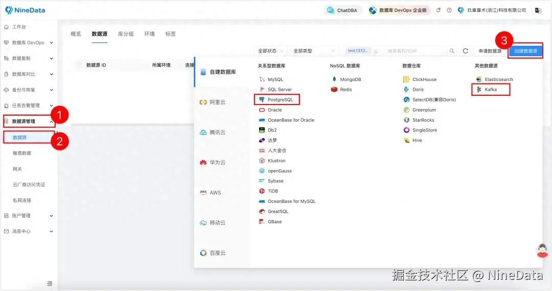 步骤一:将 PostgreSQL 和 Kafka 录入到 NineData 平台