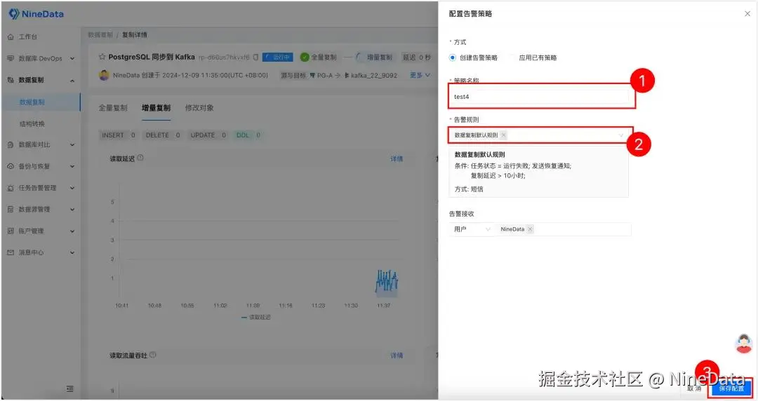 - 输入策略名称,选择告警规则,单击保存配置即可。你可以直接使用内置的默认规则,在任务运行失败,或复制延迟大于等于 10 分钟的时候,发送短信提醒你。你也可以自定义创建规则,根据你的需求来进行通知。
