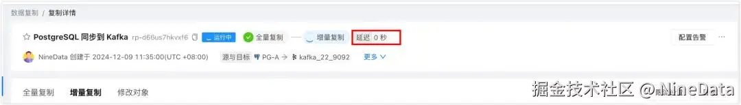 - 配置完成后启动任务,针对你配置的所有同步对象,NineData 会先对所有的存量数据进行全量迁移,接下来就是实时迁移源端 PostgreSQL 中新增的增量数据,所有新写入的数据都将一条不漏地传递到 Kafka,每当 PostgreSQL 端的增量数据已经全部写入 Kafka,并且没有新的增量数据时,任务面板中的延迟将显示为 0 秒,代表当前 Kafka 中的数据是最新的。
