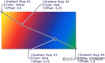LinearGradientBrush 还包含一个 GradientStops 集合,其中每个对象指定一种颜色和一个沿画笔渐变轴的偏移量。