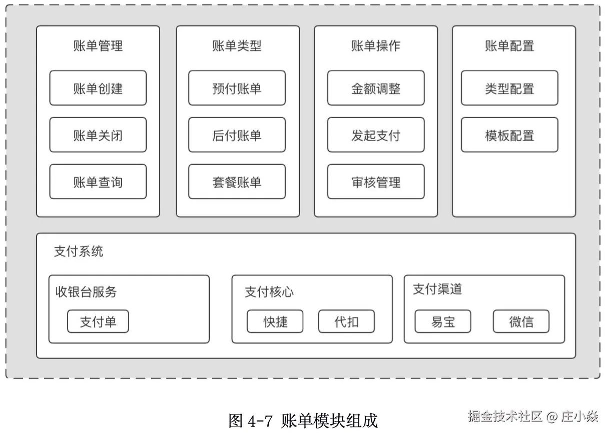 一方面是不同的账单中包含的费用不同、账单金额的计算方法不同、账单的周期、操作等会存在差别。比如保洁存在预付账单和后付账单,而月嫂存在定金账单和尾款账单,保证金业务存在保证金账单,卡券售卖业务存在卡券售卖账单。设计好一个账单子系统也是整个交易非常重要的一环,账单模块如图4-7所示: