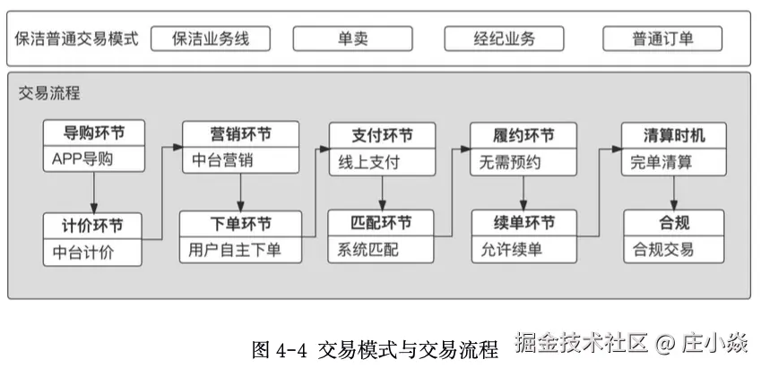 所以因为业务的不同必然会造成某些交易环节的不同,比如月嫂交易不提供线上下单而是采用线上预约、线下面试、线上签单、线上支付的模式;而保洁交易可以在线上下单、支付等全链条进行操作,这样不同的交易模式就具备了不同的交易流程组合,从而完成整个交易模型的抽象,比如保洁普通交易模式的流程安排如如4-4,其他交易模式类似。