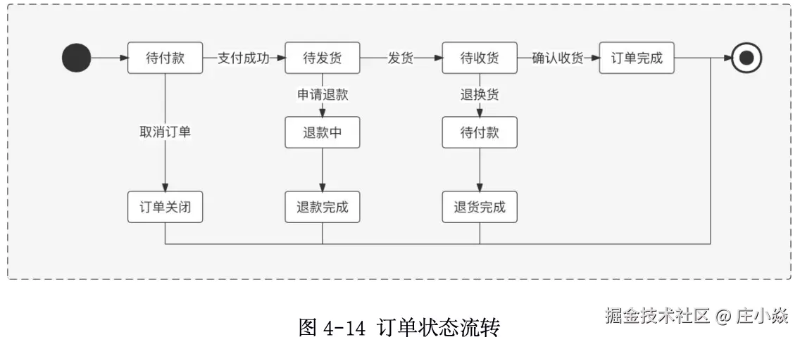 订单的状态记录了订单的变化以及流转,基于具体的业务需要设计订单的状态及变化逻辑,常见的订单状态包含一待付款,待发货,待收货,交易成功,已取消,售后中,订单关闭等,其流转关系如图4-14所示。