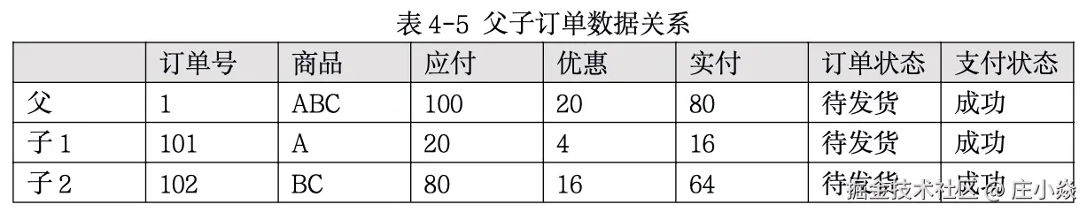这是按照店铺去拆,当然也可以基于业务需要基于其他模型对订单进行拆分,拆分订单的目的是基于业务需要或者其他需要而设计。假如购买了2个商家的ABC三个商品,总价是100元,平台优惠20元,其中A商品属于店铺1,B商品属于店铺2。订单拆分后的父子订单之间往往存在如表4-5所示的关系。