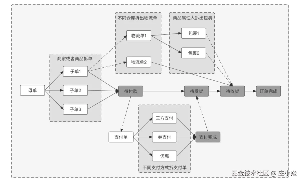 所以拆单主要是两类,一类是下单时因为商家或者仓储问题拆成父订单和子订单,另一个是在发货时因为品类或者物流因素一个子订单拆成多个发货单,如图4-15所示: