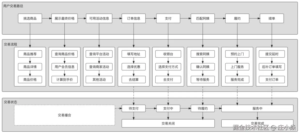 整个交易过程中,每个环节都会有相应的交易安排,例如在对优惠券的交易处理过程中,用户在购物车或者订单填写页选择了相应优惠券,就需要对优惠券进行冻结处理,下单支付成功以后对优惠券进行核销。交易的复杂之处就是众多的交易环节以及交易处理流程;其中还包括逆向交易过程,比如用户取消了订单、支付成功后发起了退款、服务完成后发起了客诉、已经上报清算后发生了逆向。综上,设计好交易的关键一步就是对业务完成全局的抽象。