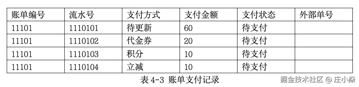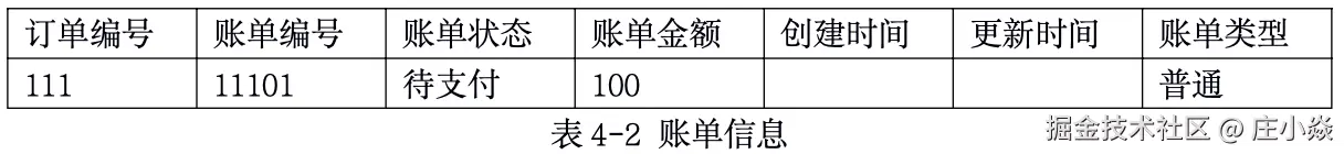 假设该订单一次性完成支付,不存在后付,基于订单信息生成生成如下账单记录,如表4-2所示: