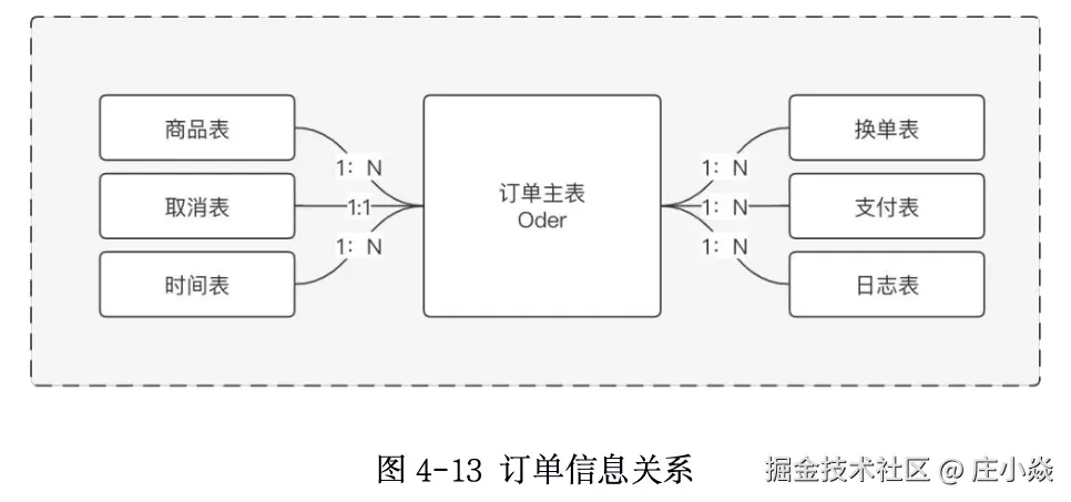 互联网产品肯定是先有了业务再有了系统,而不是先有了系统再有了业务;线下业务通过互联网实现了线上化,其中多样化的业务模型衍生出了众多的订单模型,比如电子商务的订单模型,包括实物订单模型和虚拟订单模型,纯支付交易的订单模型,外卖的订单模型等等;不同的订单模型下的订单设计存在稍微的差别,但从核心内容上讲依然存在相同的内核。我们通过图4-10可以了解这些不同环节的订单之间的关系。