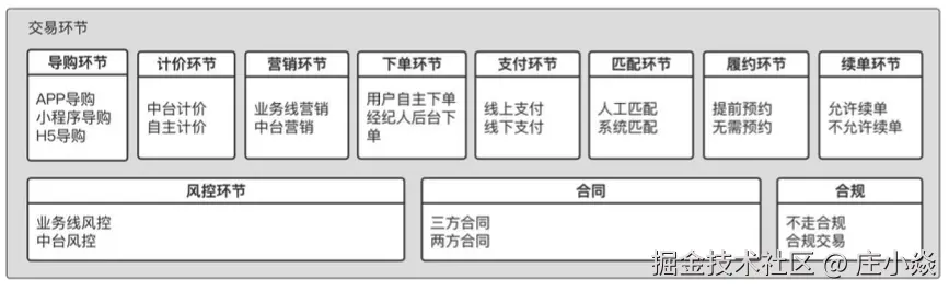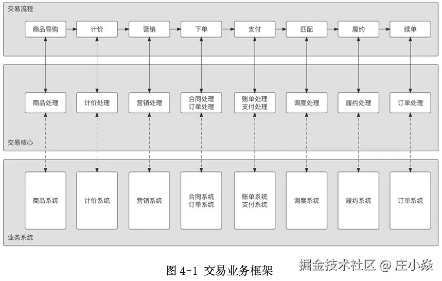 从上面的案例描述的交易全过程中,可以抽象出一个交易的业务框架,如图: