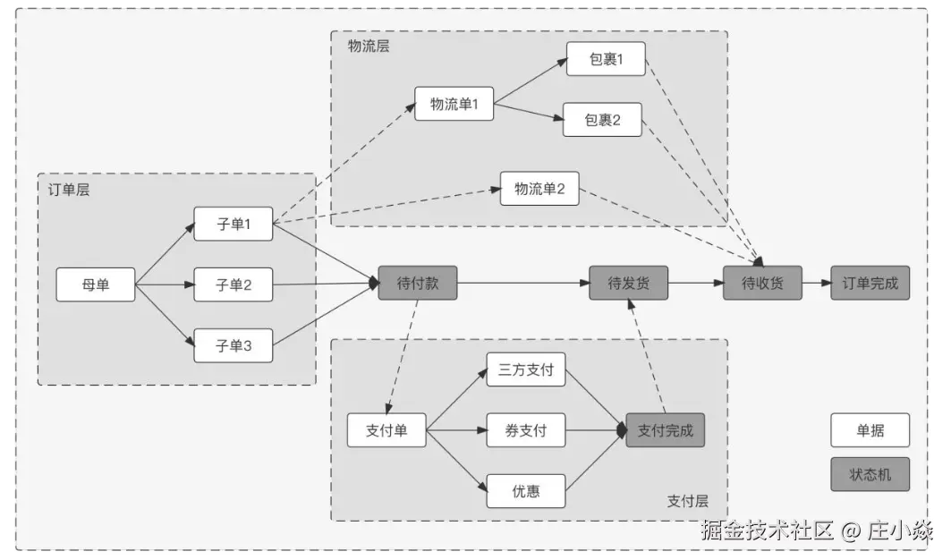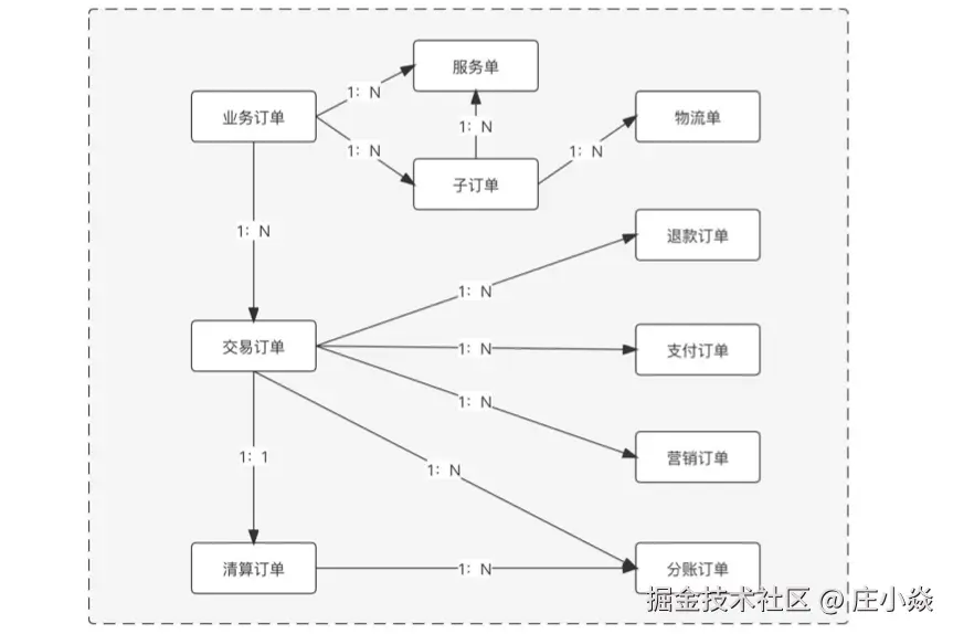 还有一些电商订单形态,比如服务单,像保洁月嫂上门服务,家电上门安装等,会有一个业务订单,用户进行支付,然后业务单拆出来服务单,可能一个订单需要3个师傅上门服务,那么就需要拆分出3个服务单,服务单主要是来控制服务的履约。