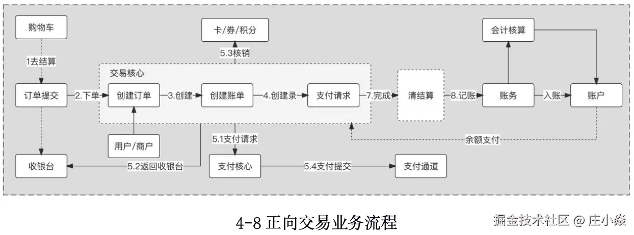 用户正常的交易流程一般是这样的一用户选好了商品、添加购物车、填写订单、去支付、等待服务履约、完成,整个交易流程可以如图4-8所以: