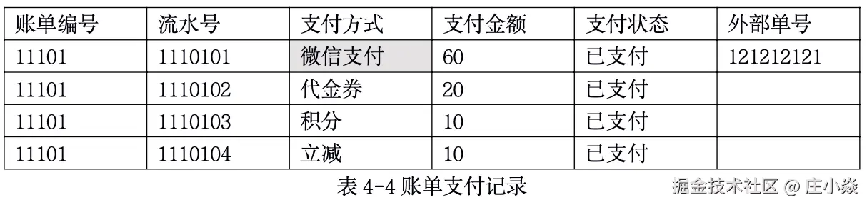 该笔账单由多种支付方式完成支付,所有支付记录关联多条,如表4-3所示