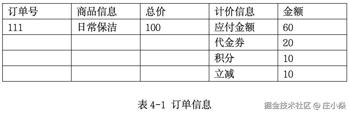 用户提交订单以后,交易核心进行账单的创建,并且发起账单的支付处理,基于支付处理结果通知订单更新订单状态:假设本次保洁服务的商品刊例价格是100,用户选择了20元代金券、积分抵扣10元、立减10元,最终应付60元,此时创建的订单表4-1。
