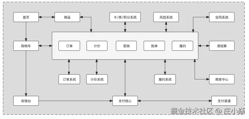 用户下单时,订单信息从各个系统获取基础数据并进行校验,最后封装生成订单;订单为基础推动其他相关系统生成其他对应的单据。