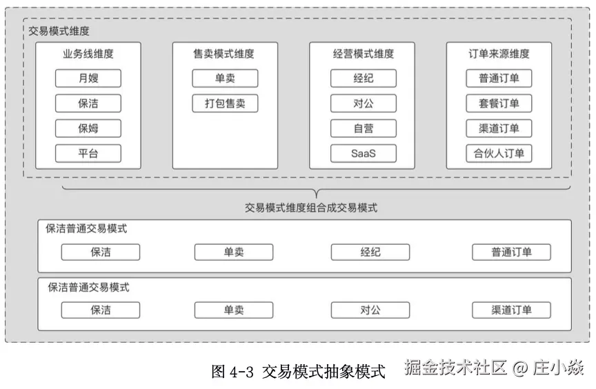 这些交易环节并不是固定的,而是随着不同的交易模式而发生变化,因为一个平台会存在多种业务类型一不同的业务线、不同的城市、不同的经营模式等,从而形成了多样的交易模式,比如月嫂自营交易模式、月嫂经纪交易模式、保洁平台交易模式、保洁自营交易模式、保姆交易;还有其他因素比如单卖还是打包售卖、经纪业务还是对公业务、内部订单还是外部渠道订单等等。这样需要抽象出交易模式,哪些因素影响交易模式,这里我们从“业务线、售卖模式、经营模式、订单来源”四个维度定义交易模式,如图4-3所示: