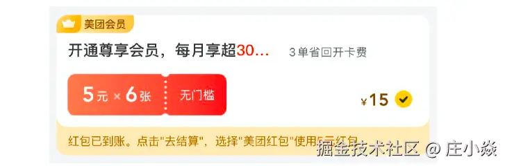 这里需要说一下美团会员,这是美团推出的一个会员服务,相当于花钱买了多张优惠券,如图3-33所示,所以购买美团会员获得优惠券也是一次交易,而且本交易要先与外卖单,因为外卖单的支付用到了这批券。